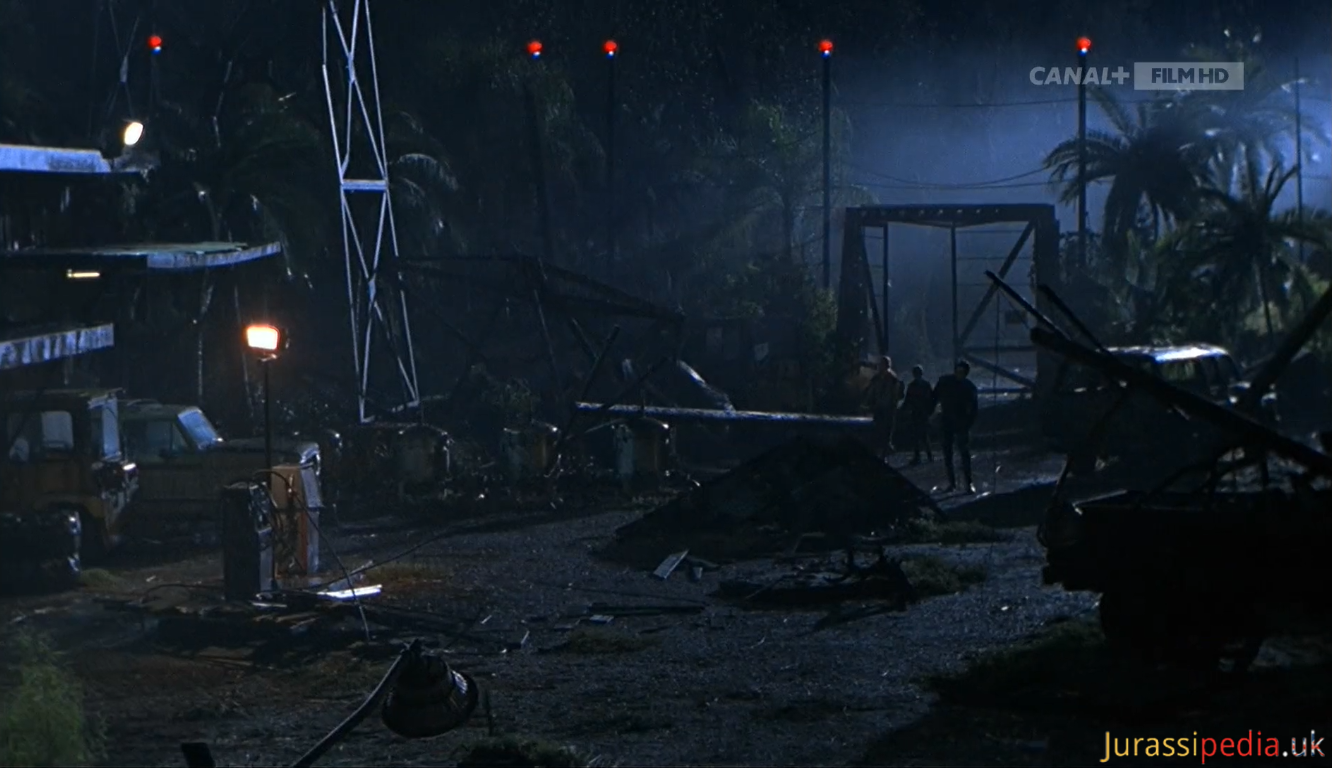 The Worker Village fencing utilized the same type as the perimeter fencing on Isla Nublar complete with the same style gating. However, the elements had taken their toll on them and by 1997 the wiring and support poles were sagging. Even with the deterioration, the fencing still is capable of running electricity as evident by the lights atop each pole being lit up when Nick Van Owen restores the power to the compound in order to send a distress call.